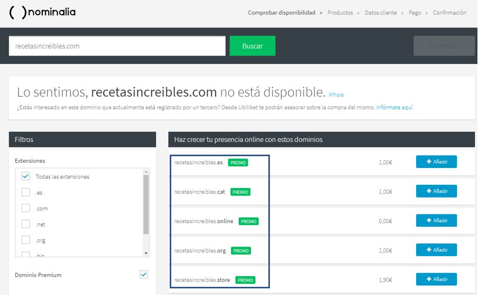 Sugerencias de dominios alternativos en Nominalia